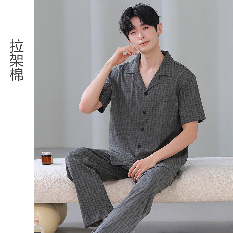 メーカー直販夏の新商品スポット男性パジャマシンプルで快適な半袖長ズボンの家庭服セットは外着ができます。