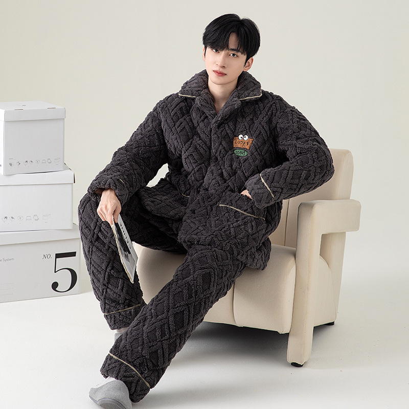 新しいパジャマの男性の冬のサンゴの毛の3層は綿を挟んで厚いベルベットの保温のカーディガンをプラスして襟をひっくり返して家の服を着ることができます。