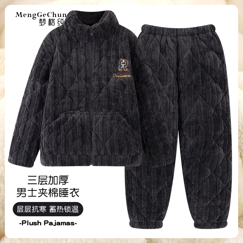 パジャマ男の冬は厚いベルベットの三層は綿入れの上着を挟んで暖かいサンゴのベルベットの冬の男性の帽子の家の服のセットを挟んでいる