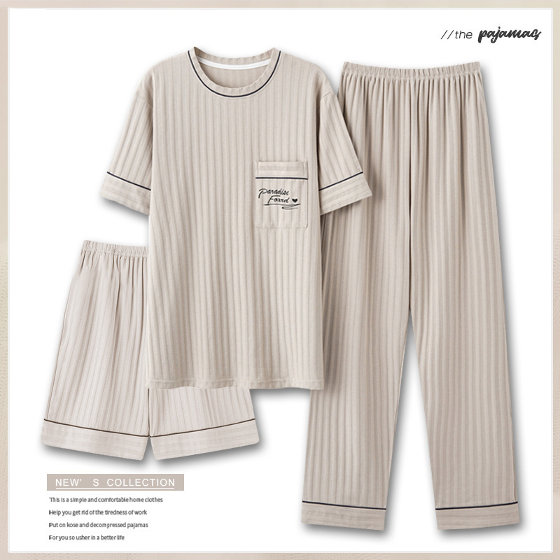 夏のパジャマ男性シンプルカジュアル半袖長ズボン3点セットゆったり大きいサイズ青年丸襟ホームウェア