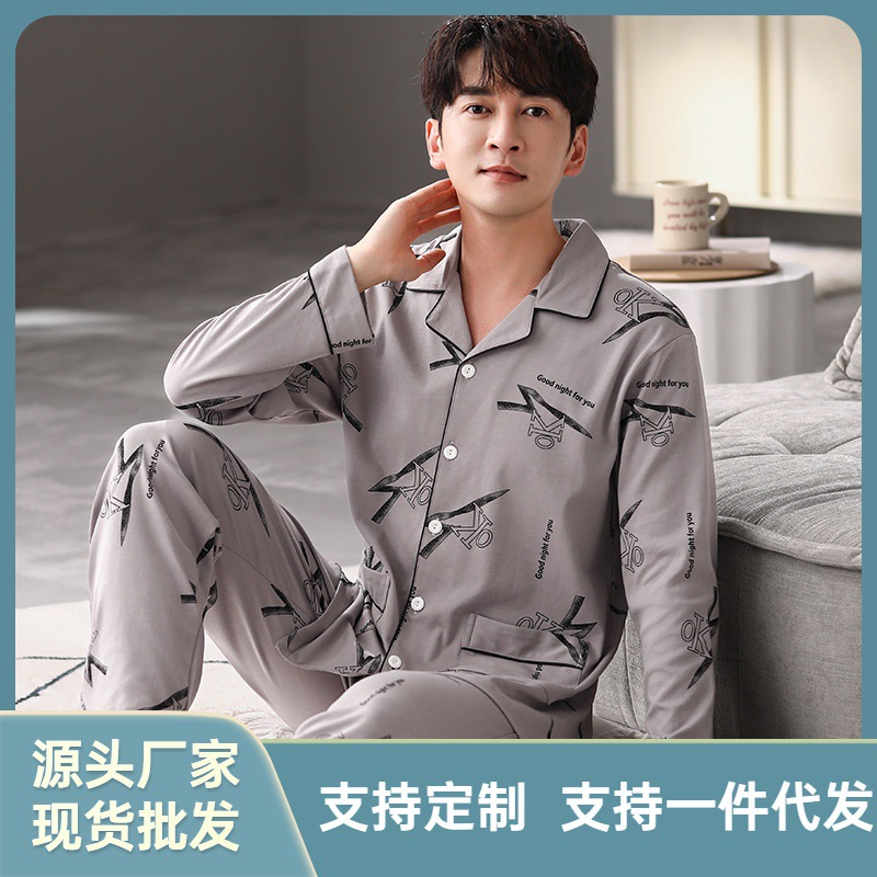 精練綿パジャマ男性春秋新長袖カーディガン家庭服カジュアルシンプルi対外貿易パジャマ2点セット