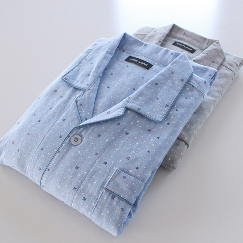 メンズパジャマ春と秋の夏のシンプルな無印風色紡織綿ガーゼの薄い長袖の新しい家庭服セット