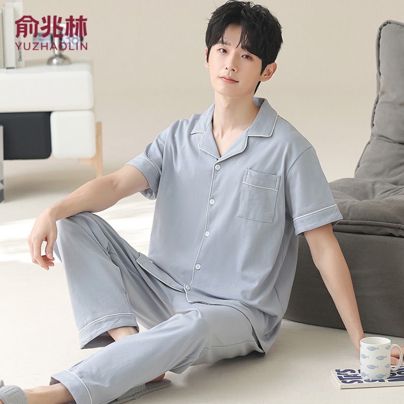兪兆林春夏の新型男性純綿パジャマ半袖の薄い襟は家庭服のスーツを着ることができます。