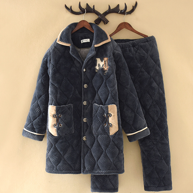 中長タイプの男性パジャマは冬の三階に厚いサンゴのベルベットが綿を挟んで厚い冬には家庭服を着ることができる