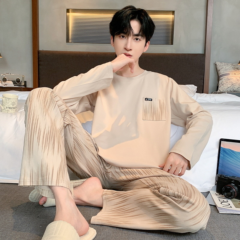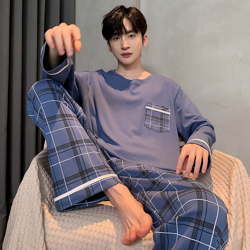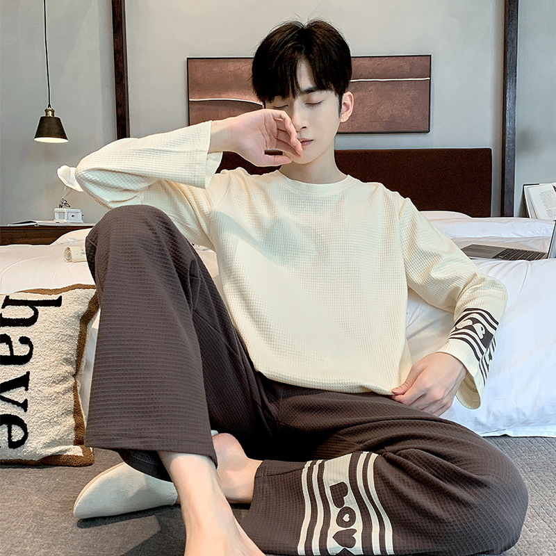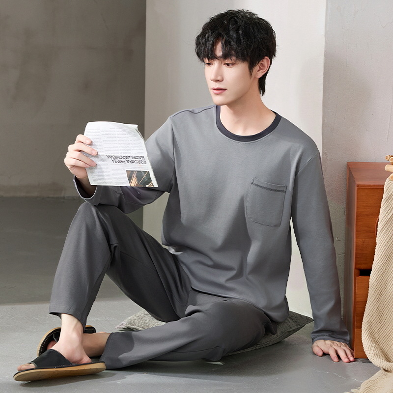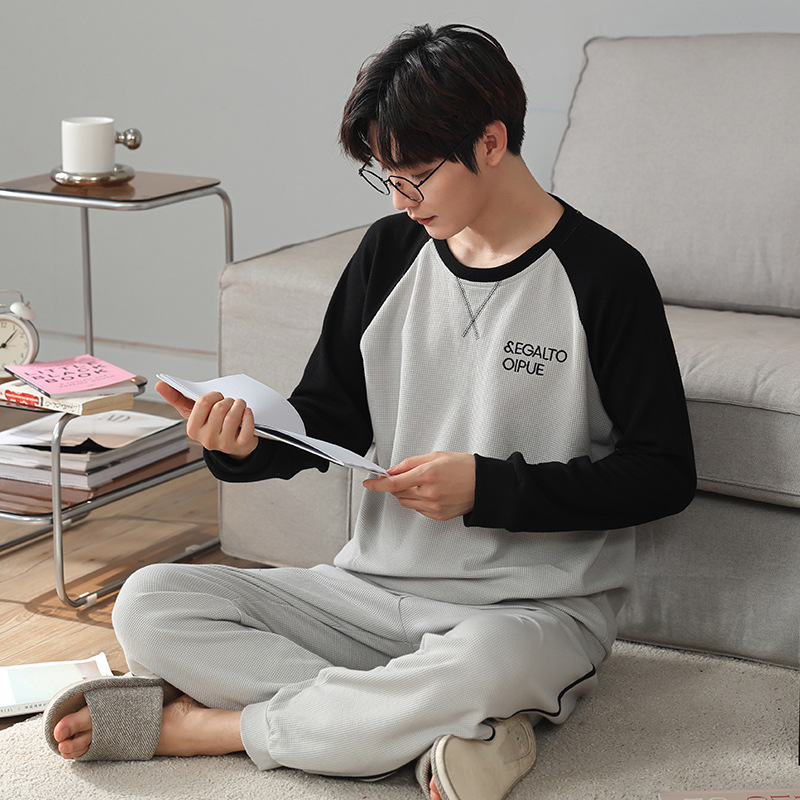 ティーンエイジャー向け秋用丸首長袖長ズボンメンズ純綿パジャマ厚手通気性ホームウェア男性用ホームカジュアル