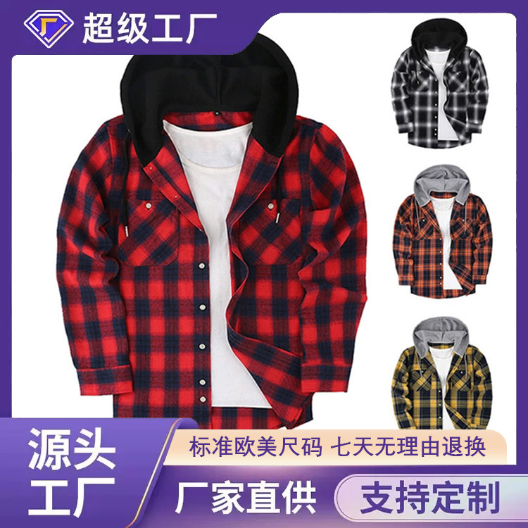 2026年春の新作、アマゾンで人気のゆったりとしたカジュアルなフランネル長袖フード付きチェック柄シャツ、男性用、高級感あり
