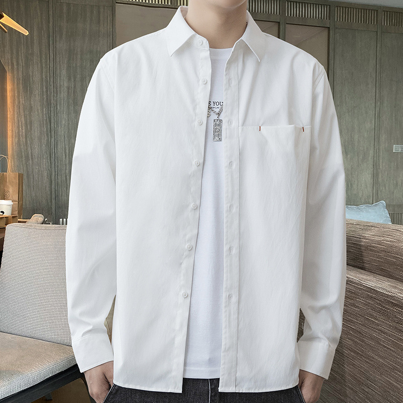 秋の新型男性シャツの純色の青少年はカジュアルな白いゆったりとした日本式の香港風のシャツのコートをめくっています。