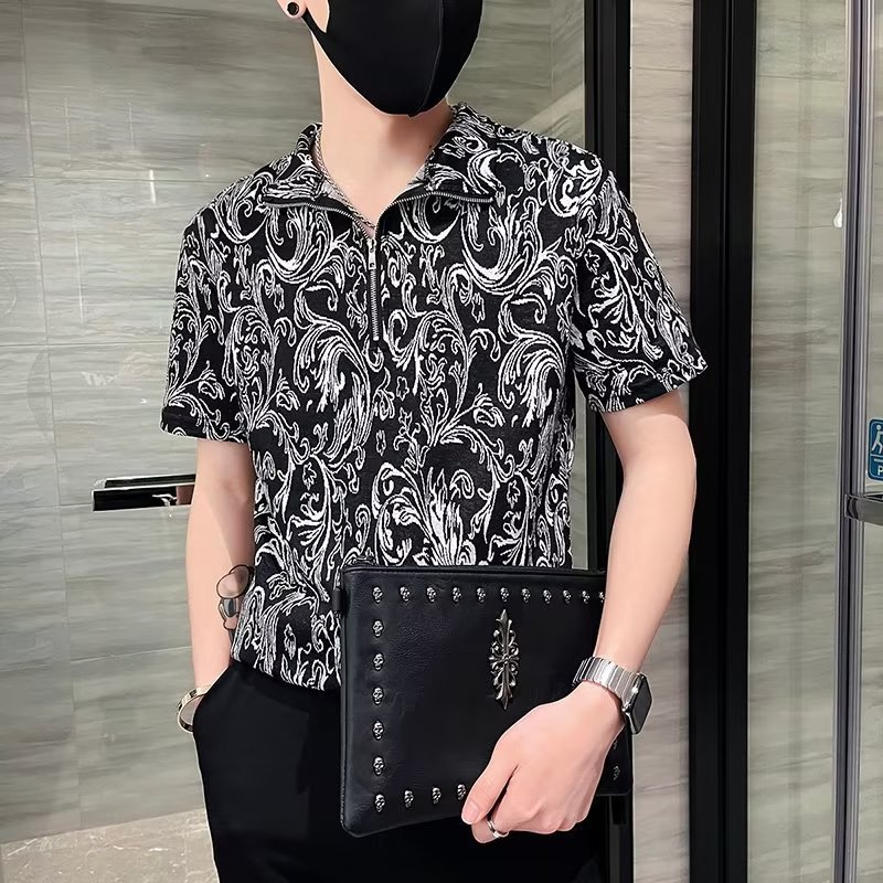 ヨーロッパステーションハーフジッパーデザイン半袖シャツメンズ夏のトレンディなカジュアル半袖薄いカラフルなTシャツトップ
