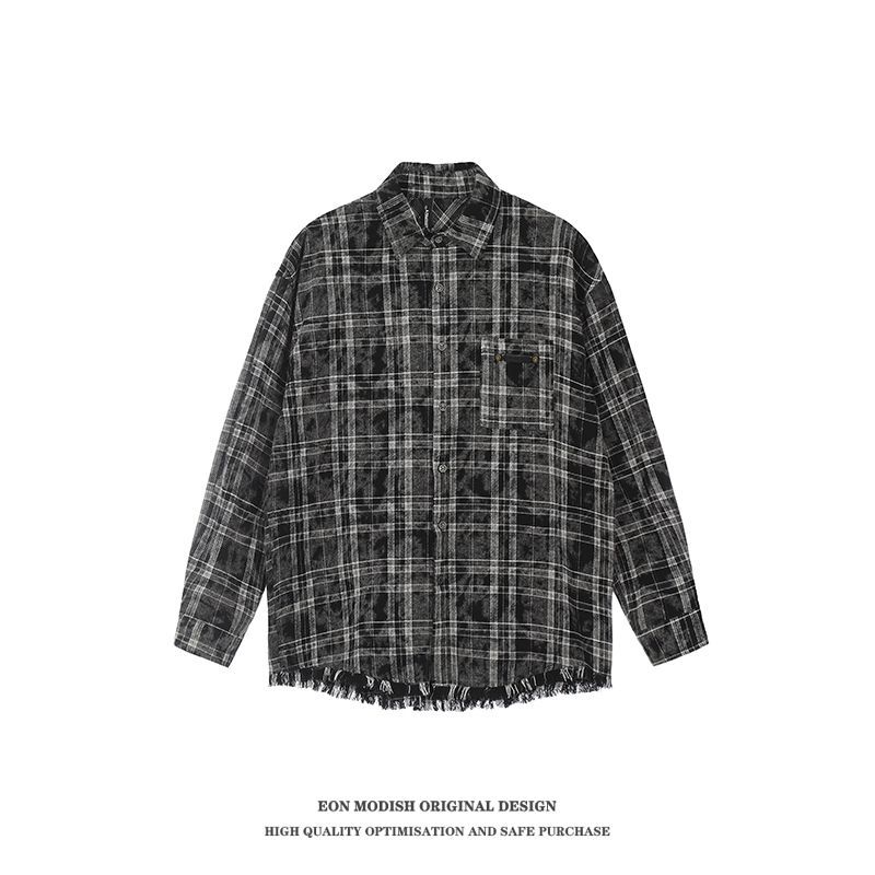 EONMODISHメンズ | 2024秋の新商品はアメリカ街の潮の白黒の毛の縁の格子のシャツを実写します。
