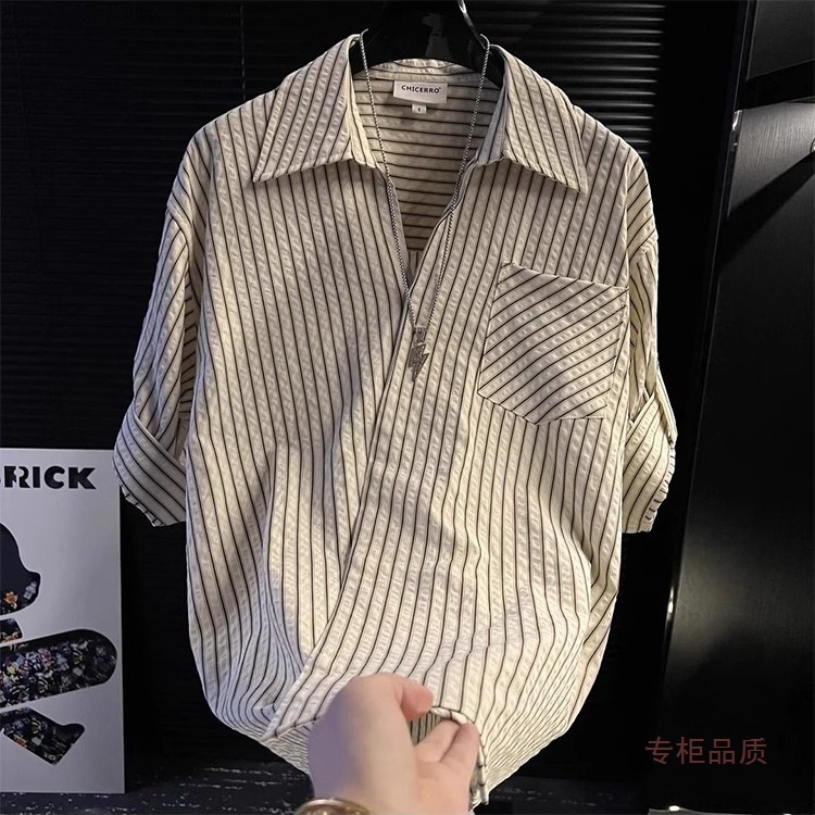 23年欧米の古典的な半袖シャツ男性夏の襟poloゆるい逆三角刺繍デザイン上着