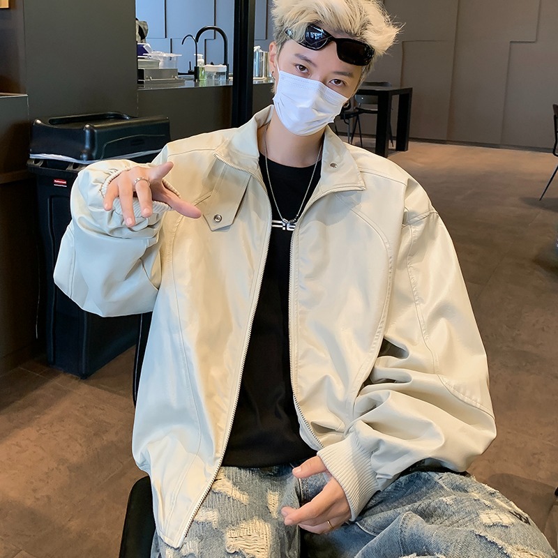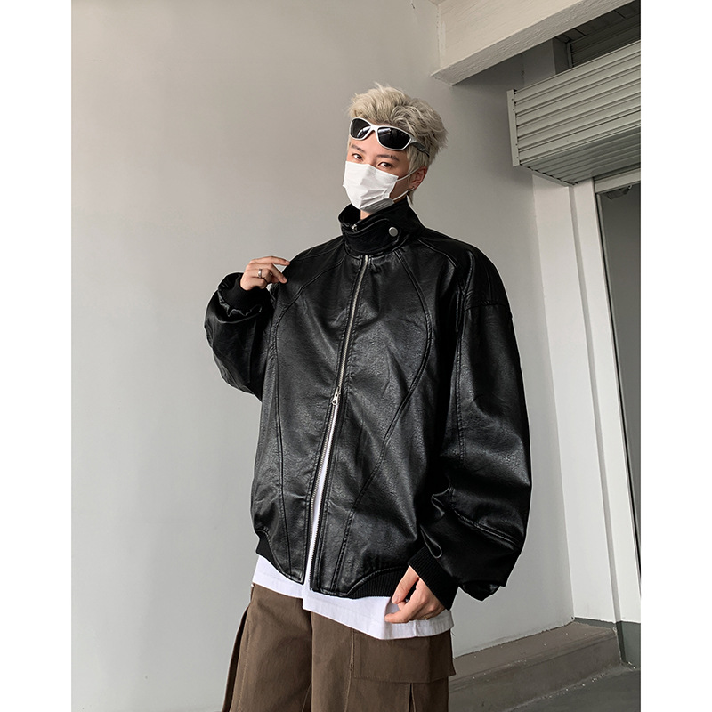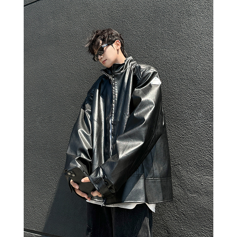 韓国版肩掛け立襟解构pu皮衣ショートジャケット男性用高級感機関車服カジュアル工装皮コート
