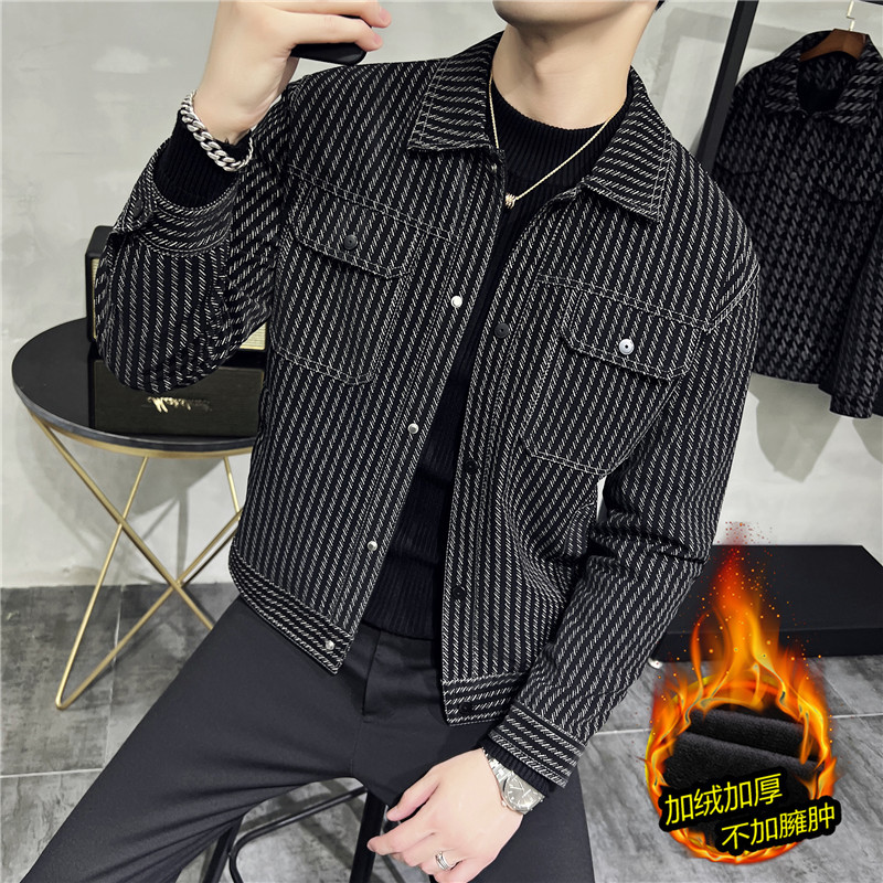 冬の新型男性ファッション革服ジャケット男性修身襟付きの短いストライプの厚いベルベット保温男性コート