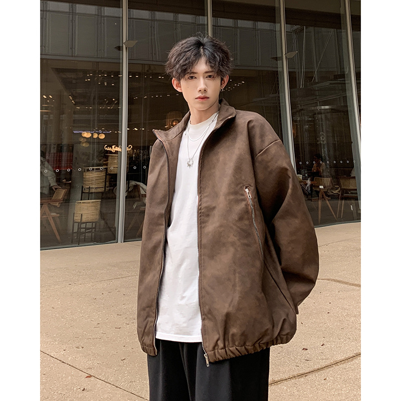 アメリカのレトロなカジュアルな古い茶色の機関車の毛皮の服のコートの男性のファスナーのデザイン感の短い純色のスタンドカラーのジャケット
