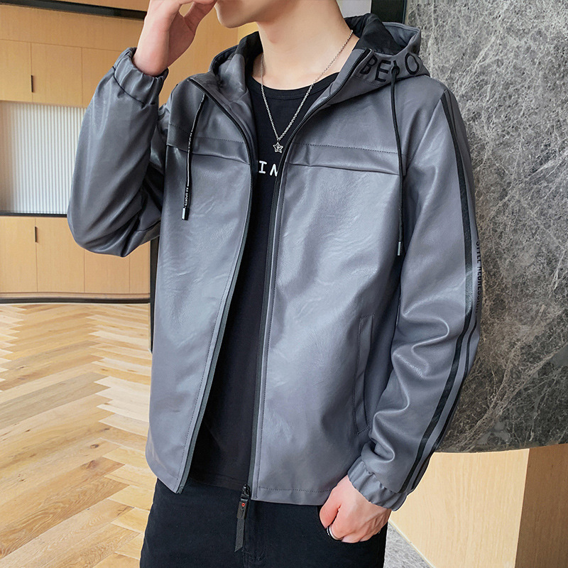 クロスボーダー秋冬新作PUジャケット男性純色ファスナーフード付きカジュアルコート男性