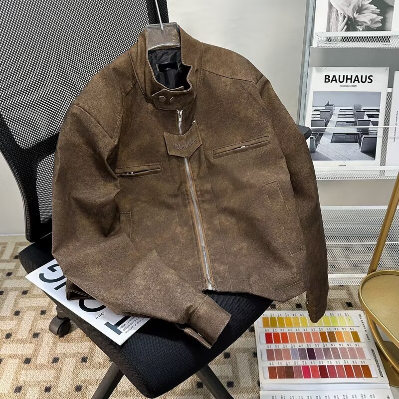 2024秋の小衆機関車のレトロな立襟デザインの皮衣ジャケット
