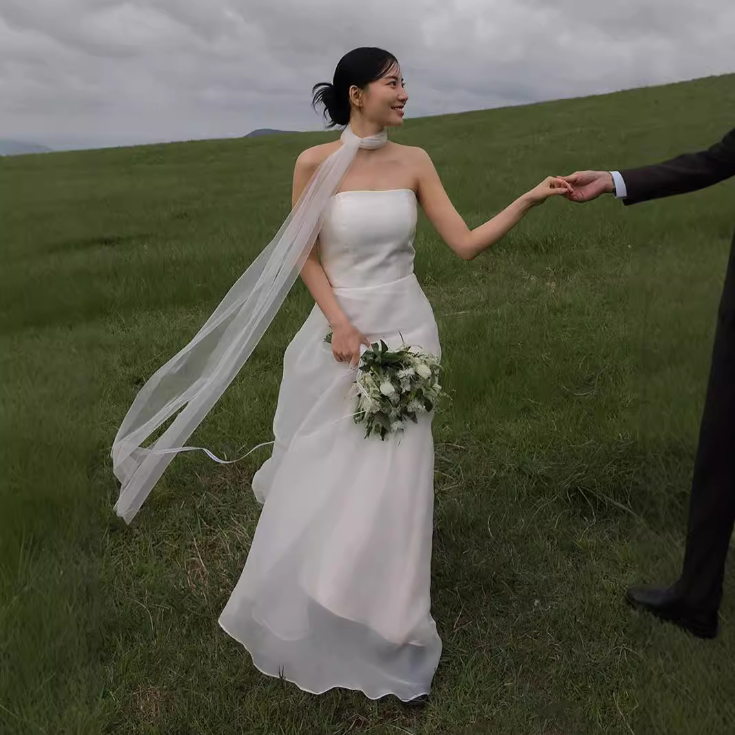 フランス風チューブトップ軽ウェディングドレス2025秋新作森系サテンレセプションドレスフィッシュテールスリムドレス工場直送