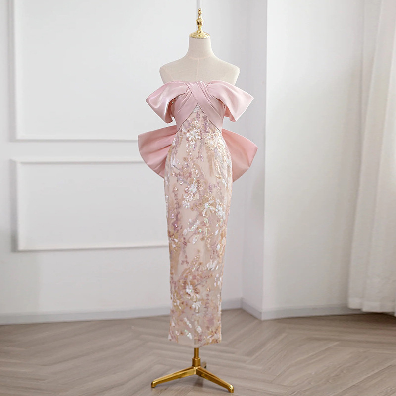 一字の肩のピンクのドレスの宴会の気質の婚約のワンピース