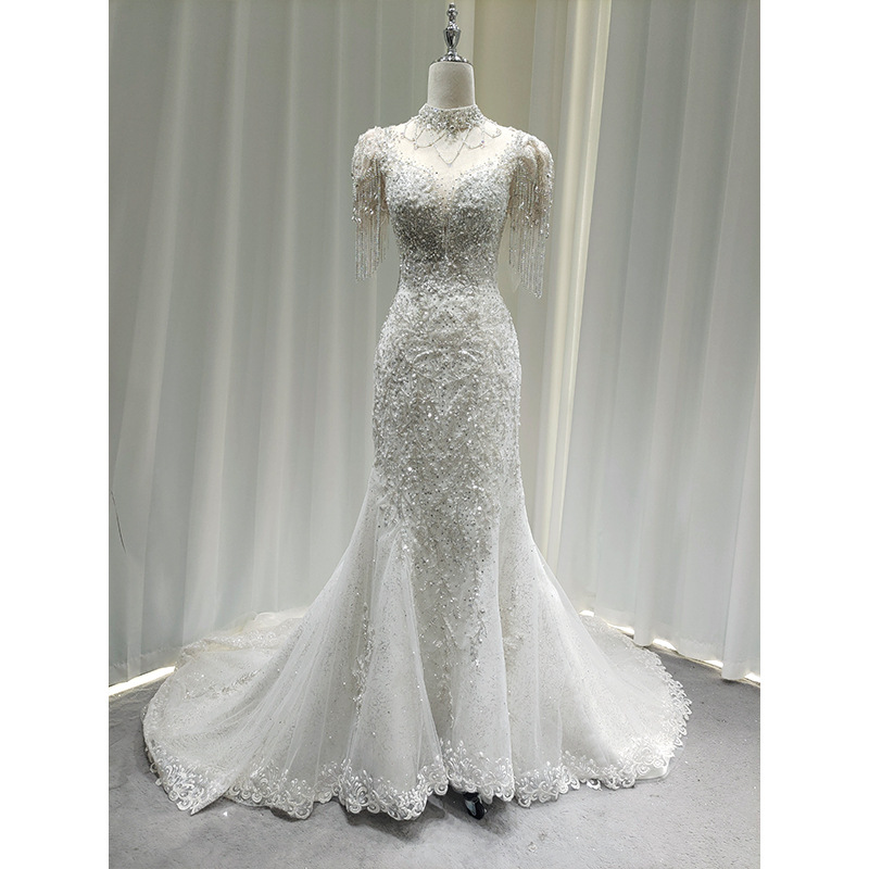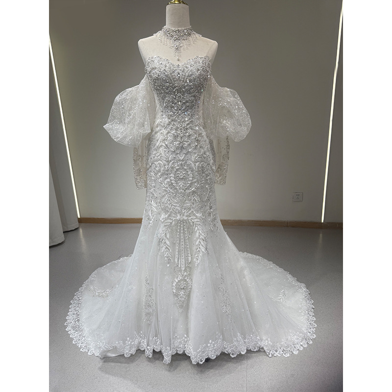 フィッシュテールライトウェディングドレス 2025 新しいブライダル高級重工業ウェルカムガーゼフレンチレースメインガーゼウェディングトレーリングドレス