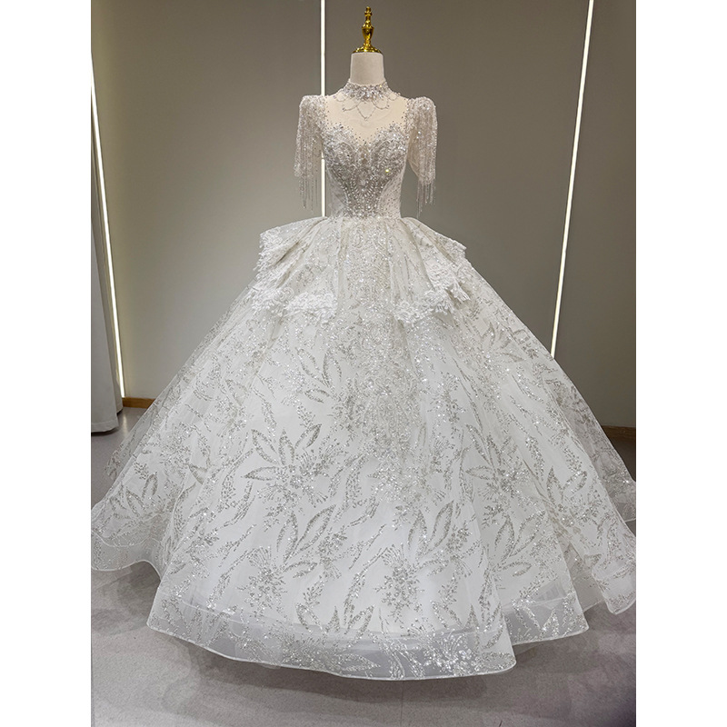 フランス式の軽いウェディングドレス2025の新型の新婦の復古の重工業の宮廷風の高級感の主な紗の小さい背の尾を引くドレス
