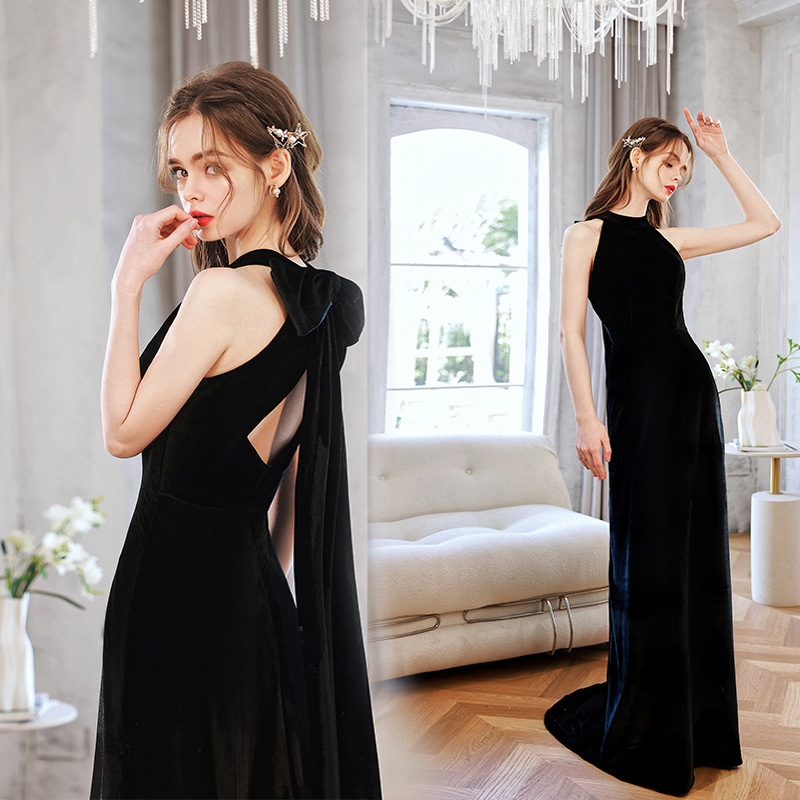 黒いベルベットの首付きドレス2025新夏誕生日ディナーピアノ衣装司会者ドレス
