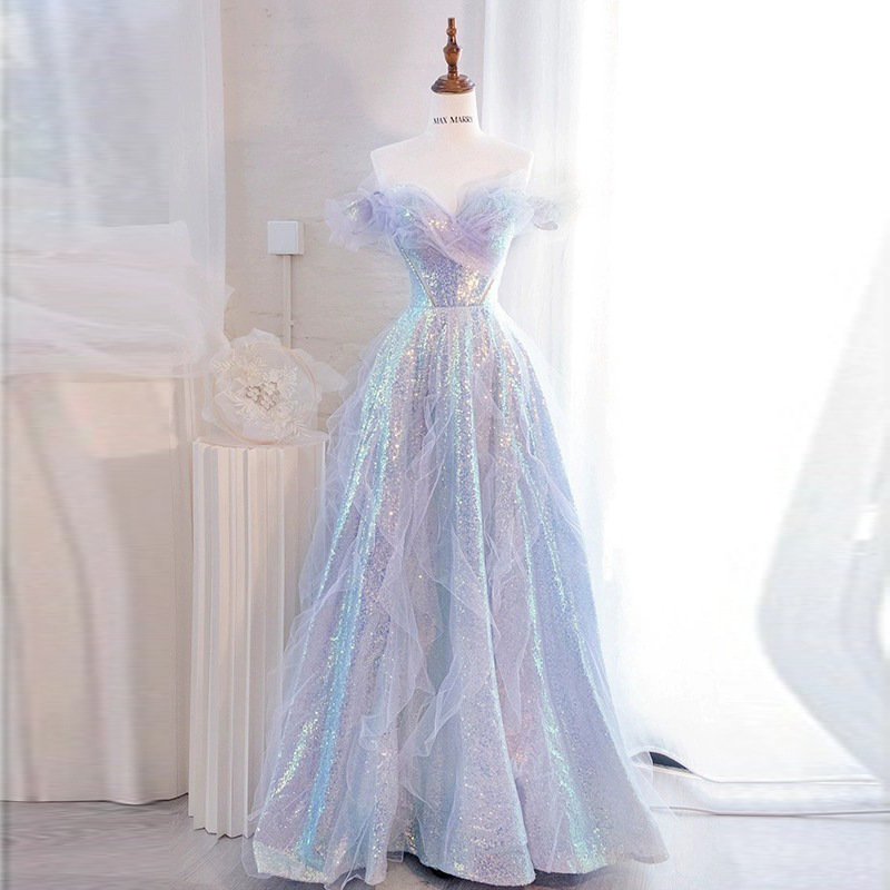 パーティードレス2025新型夏のフランス式の肩の美しい金の輝く蓬のスカートの成人式の芸考のドレスのスカート