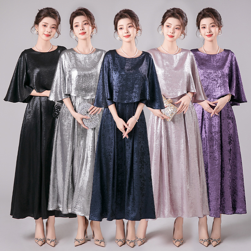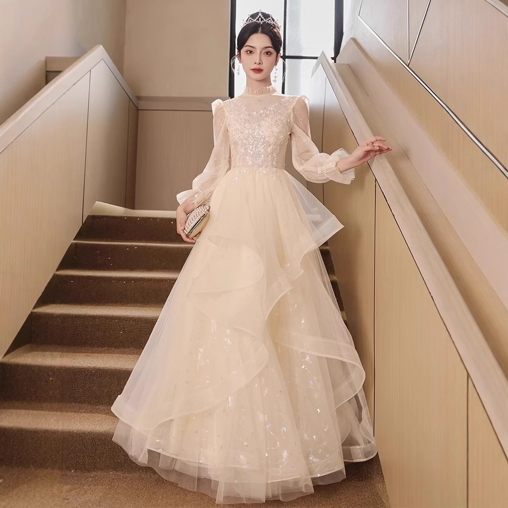 シャンパンカラーのイブニングドレス2025新作秋の宴会気質淑女介添人ドレス司会者エレガントなドレス
