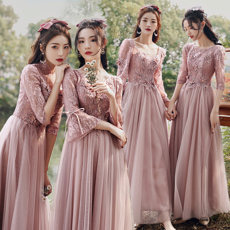 ピンクのブライズメイドドレス、ハイエンドの2025新しい冬の長袖プチシスターズグループドレス、女性用、スリムでスリム