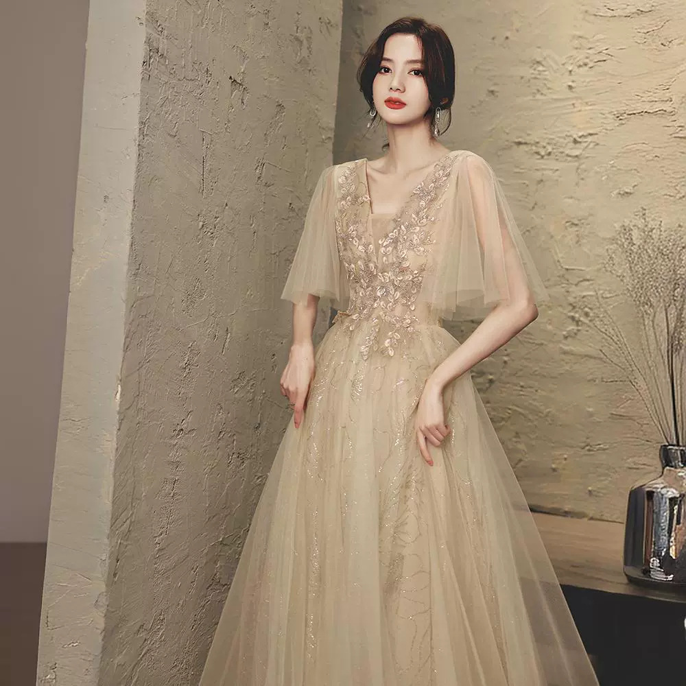 シャンパンイブニングドレス女性のための 2025 新しい宴会スリム気質年次総会ホストドレスハイエンド