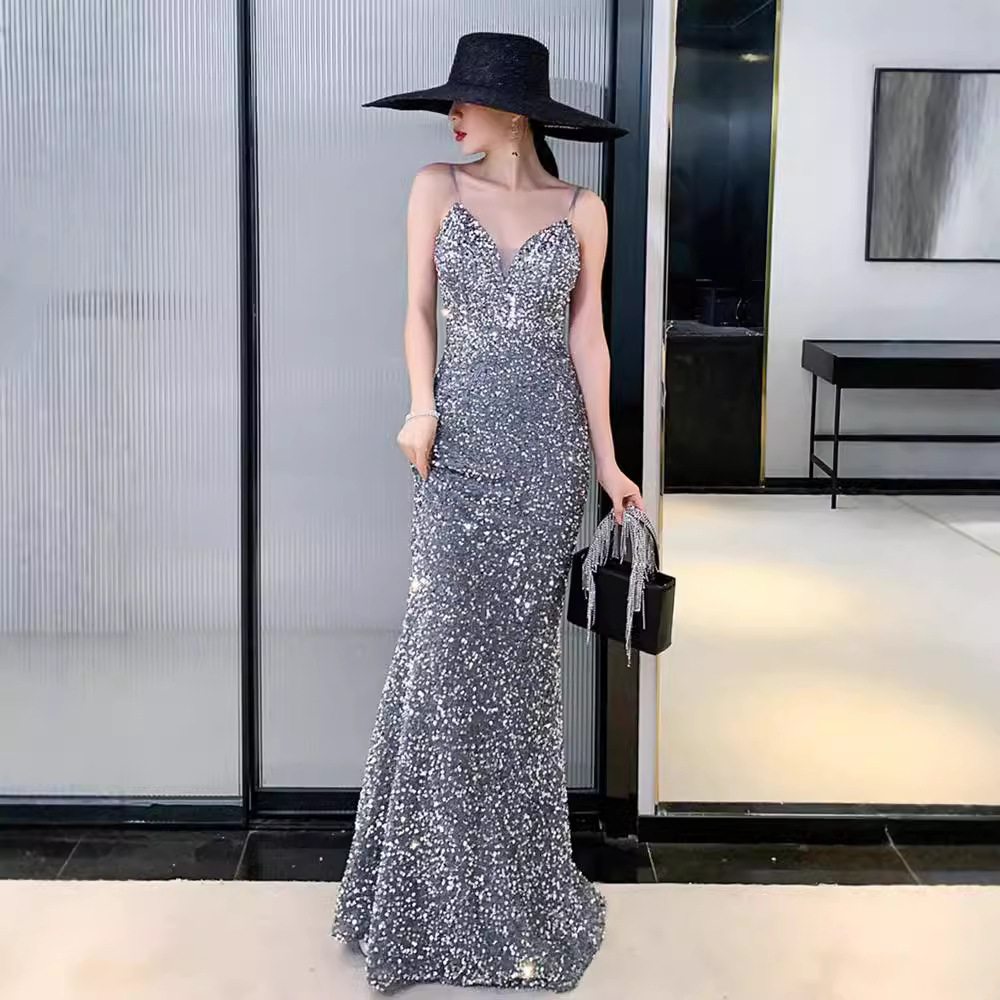 2025年新作 キラキラ輝くシークインのクロスボーダーフィッシュテールイブニングドレス 女性用 エレガントな司会者向けセクシーな背中見せブライダルドレス