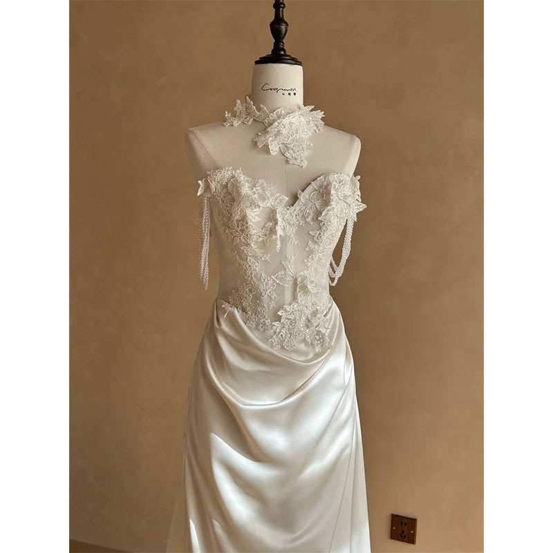 フレンチライトウェディングドレス、シンプルでスーパーフェアリーレースウェルカムガーゼ、社交界の宴会ワンショルダーホワイトサテンドレス