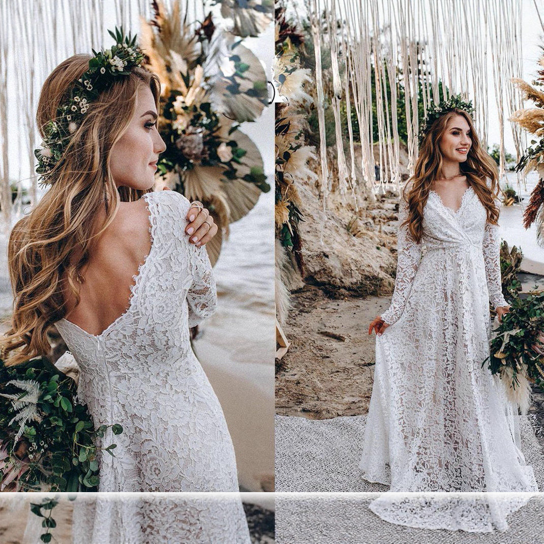 クロスボーダー女服白深いvネック長袖ワンピース透視セクシーレースウエディングドレスドレスロングスカート女性