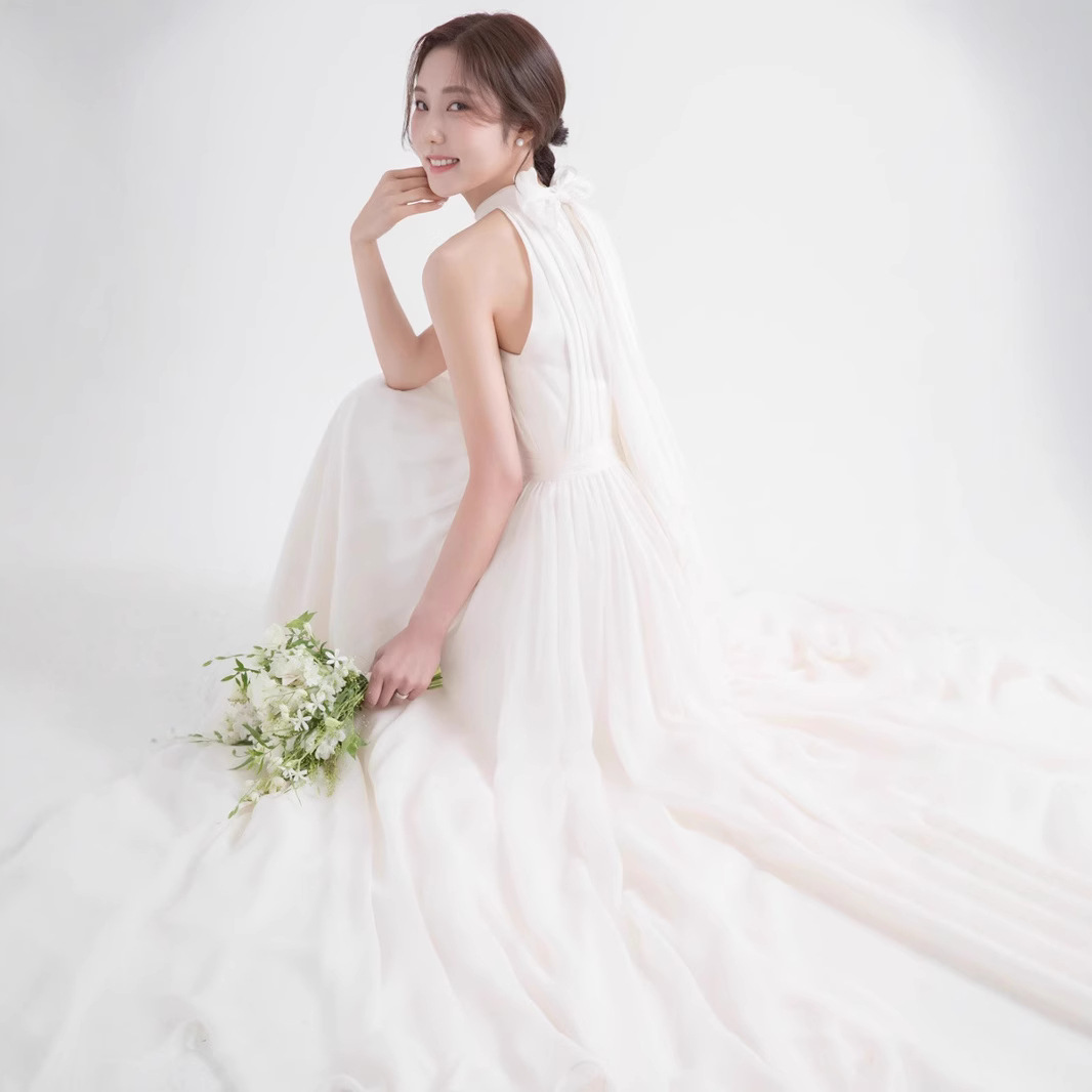 2025年新作 ホルターネックウェディングドレス 小さなトレーン 細見え バックレス ウェディングフォト 森系 お出かけ 軽やかなドレス 結婚式