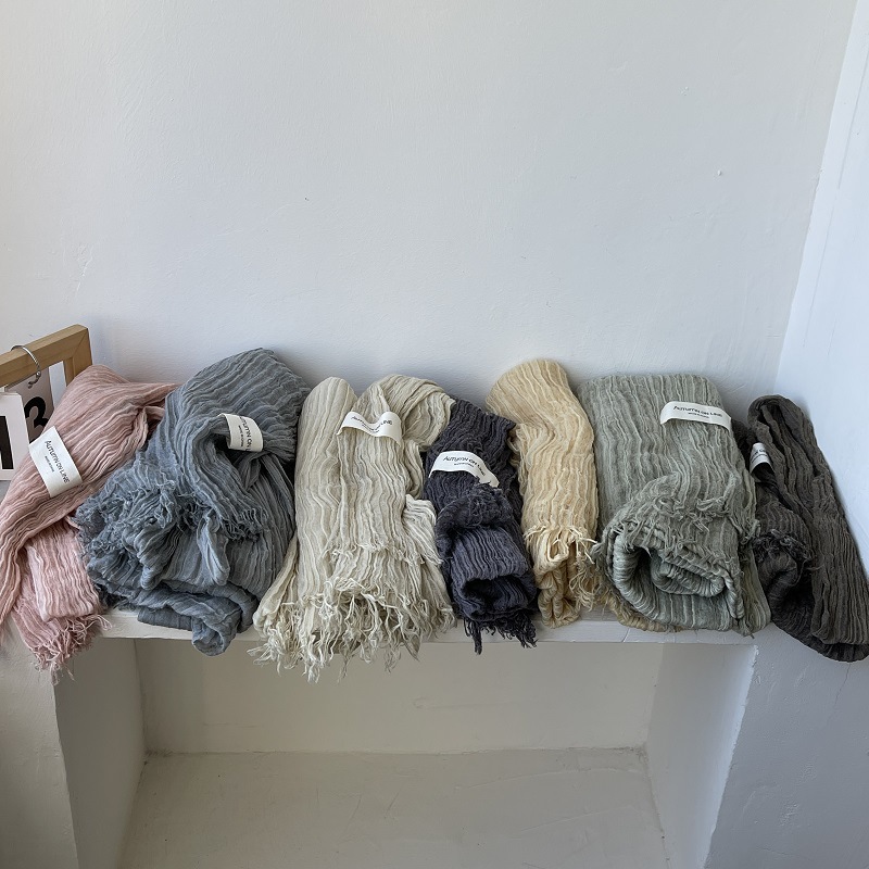 韓国東大門の綿麻を自作して古いしわのマフラーをします。