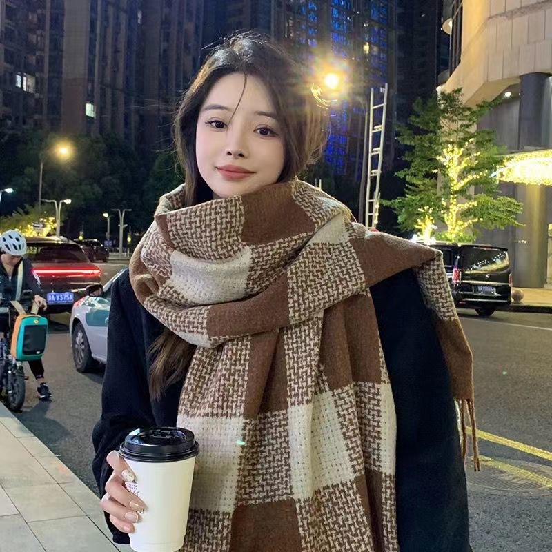 新しい秋冬千鳥格のマフラーの女性韓国版は厚くて保温しています。