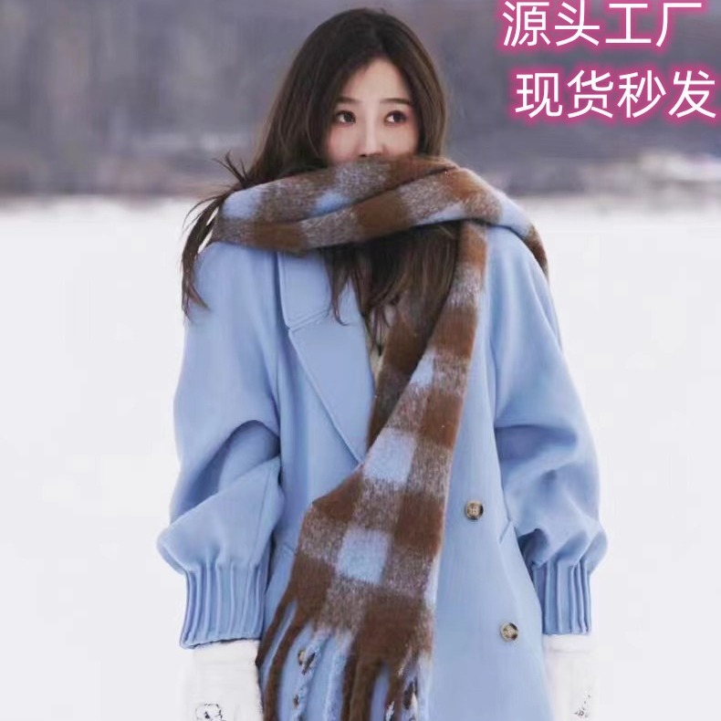 韓国の虞書欣が爆発した高級感のある格子マフラーの女性は冬にカシミヤのマフラーに似せて保温ストールを厚くします。