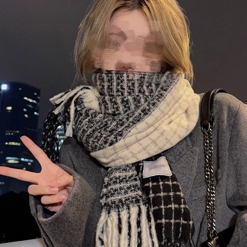 韓国版百合両用アルファベットccジャカード新型秋冬格子両面保温模造カシミヤ流蘇マフラー女