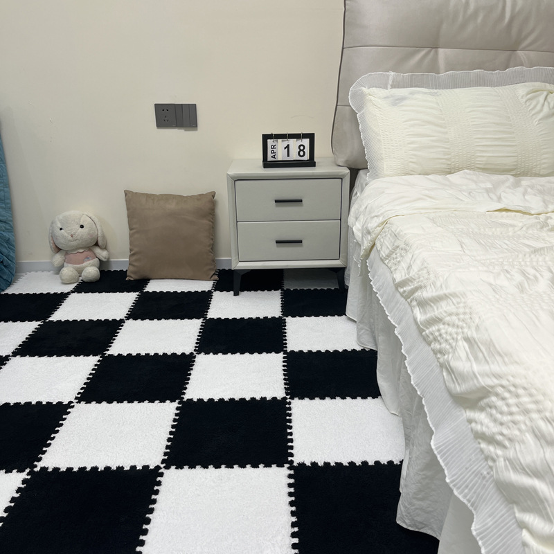 じゅうたん北欧客間寝室のベッドサイドには、ぬいぐるみの泡が敷かれて広い家庭用マットマットが敷かれている