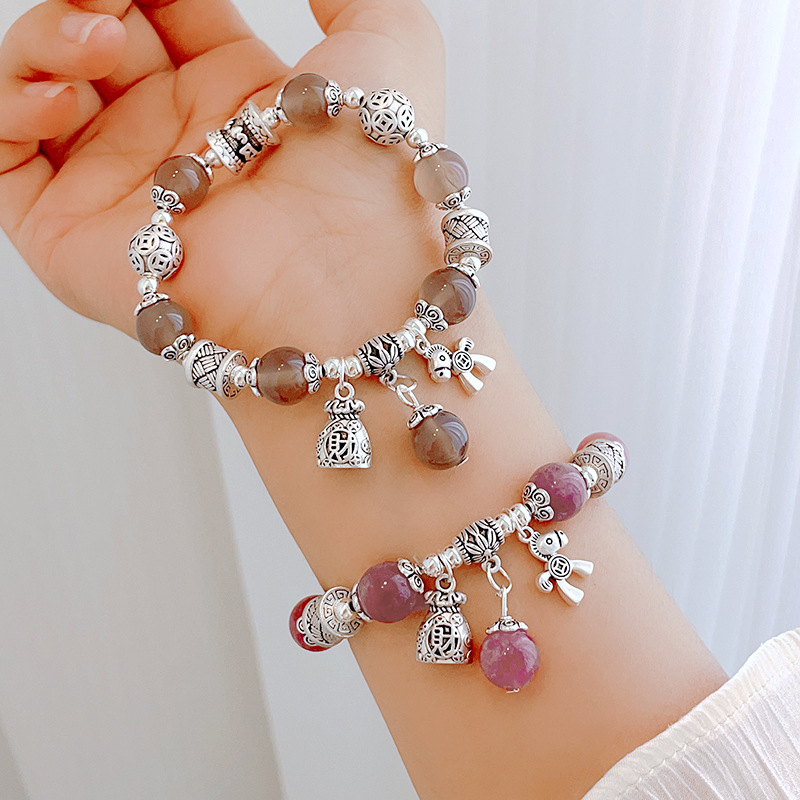新中国式チベット銀ブレスレット観光スポット瑪瑙水晶馬招財銭袋数珠古銀飾品寺のアクセサリー