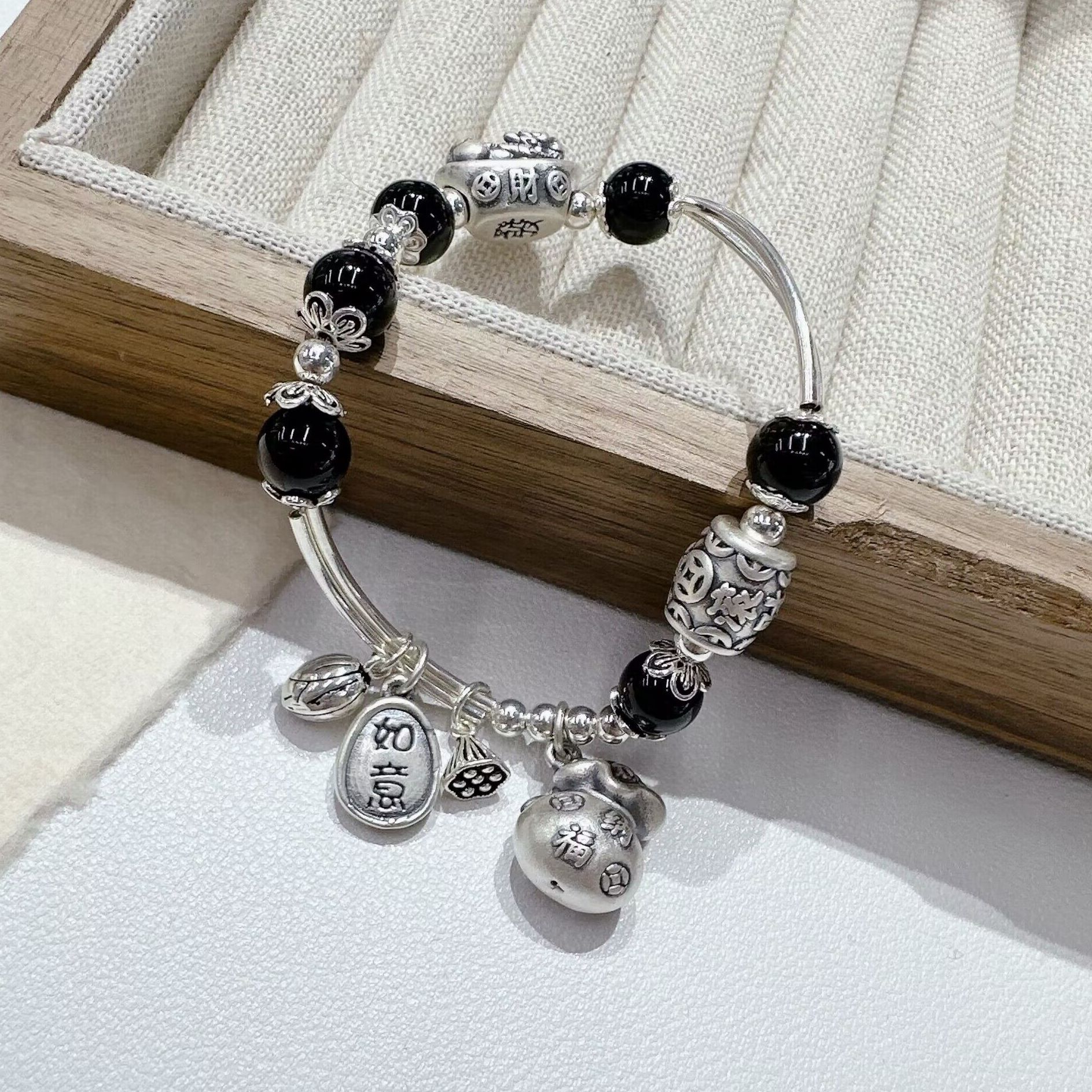 レトロ銭袋瑪瑙手串s925純銀小衆古風蓮蓬ブレスレット女性招財納福輸送プレゼント