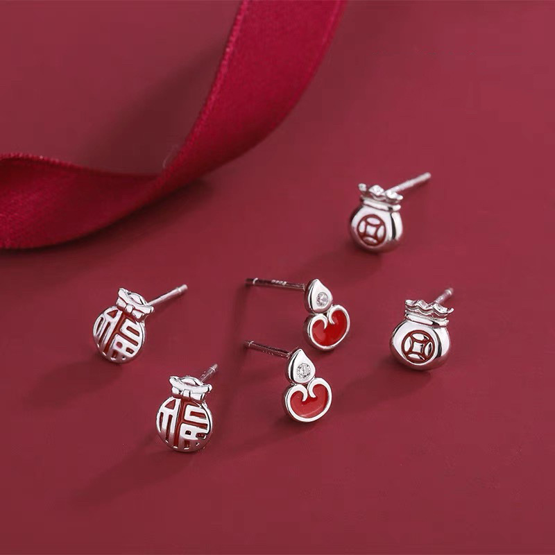 S999足銀銅銭福袋ピアス女性軽豪華小衆中国風養耳穴ピアス新年赤いイヤリングアクセサリー