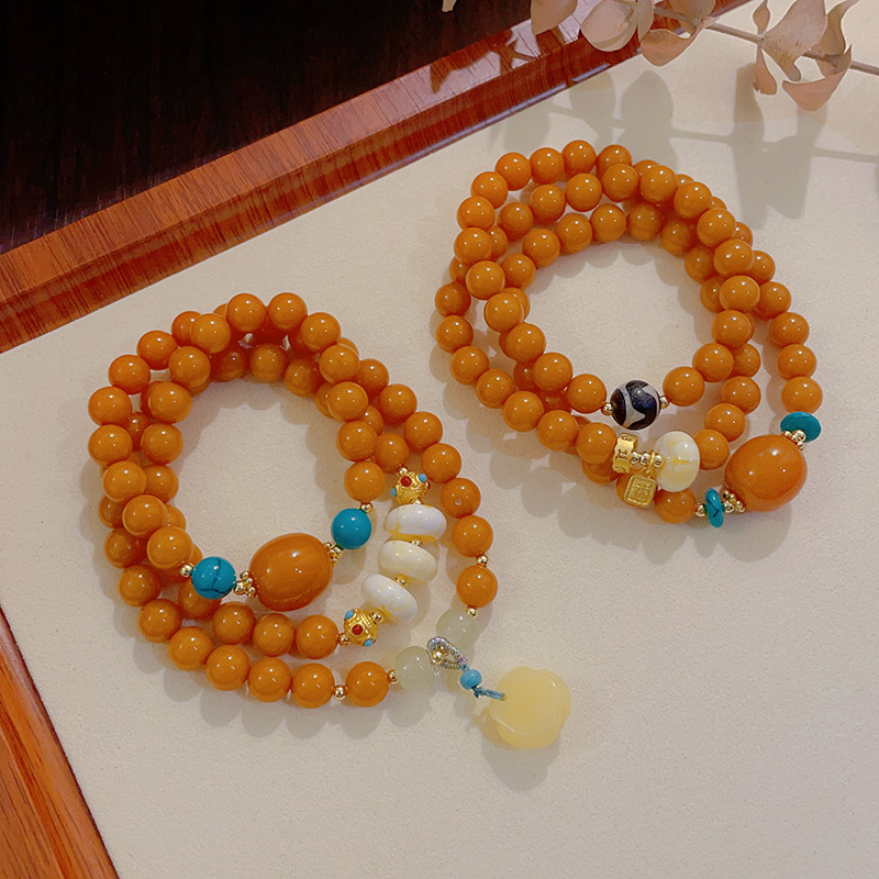 新しい中国風模造蜜蝋マルチサークルブレスレットフラワーペンダント仏ビーズロザリオ景勝寺院人気の3サークルブレスレット