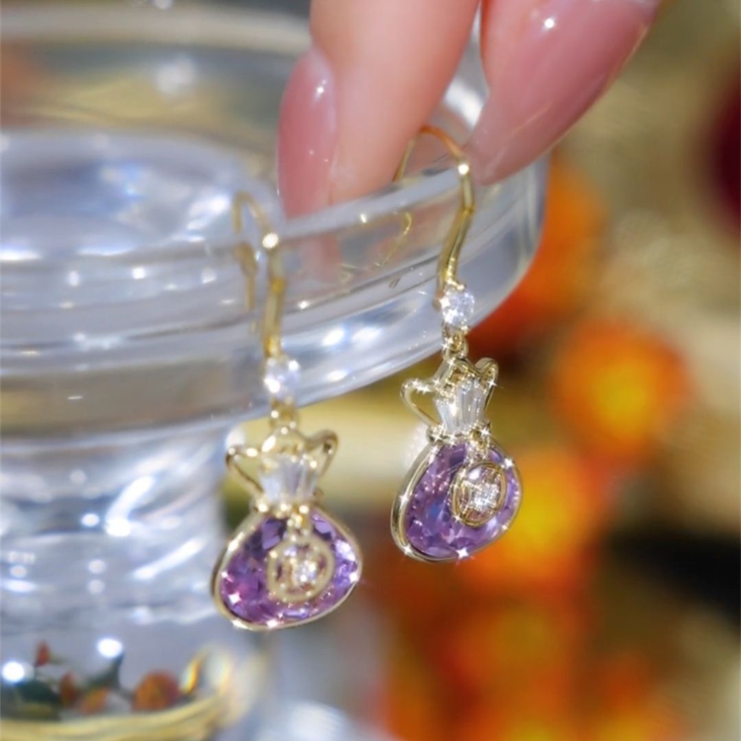 紫色の招財耳フック金銭袋イヤリング女性の古典的なキラキラデザイン感ネット赤百合耳飾り2023新ファッション