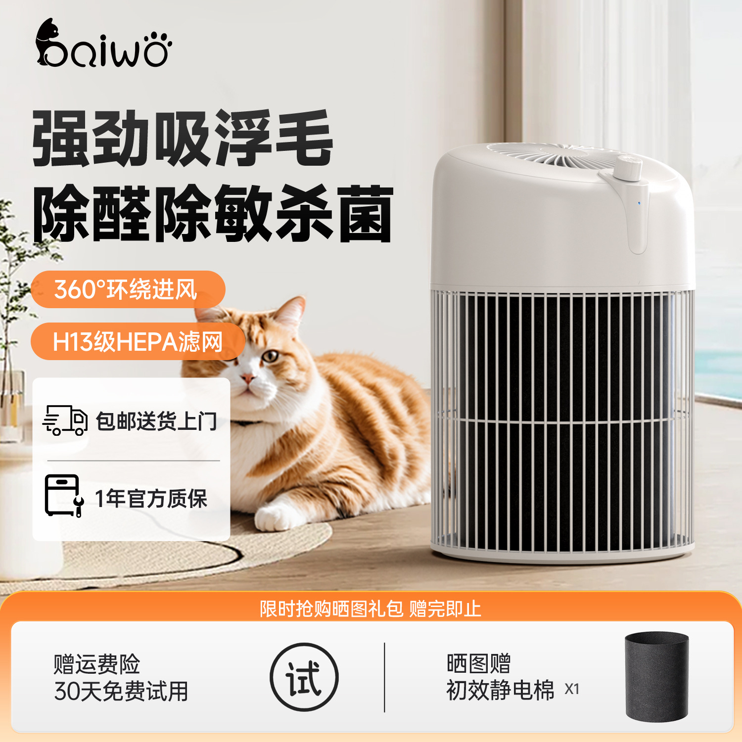 Baime 家庭用ペット空気清浄機、猫の毛除去機、猫飼育用全自動吸着浮遊毛収集加工品