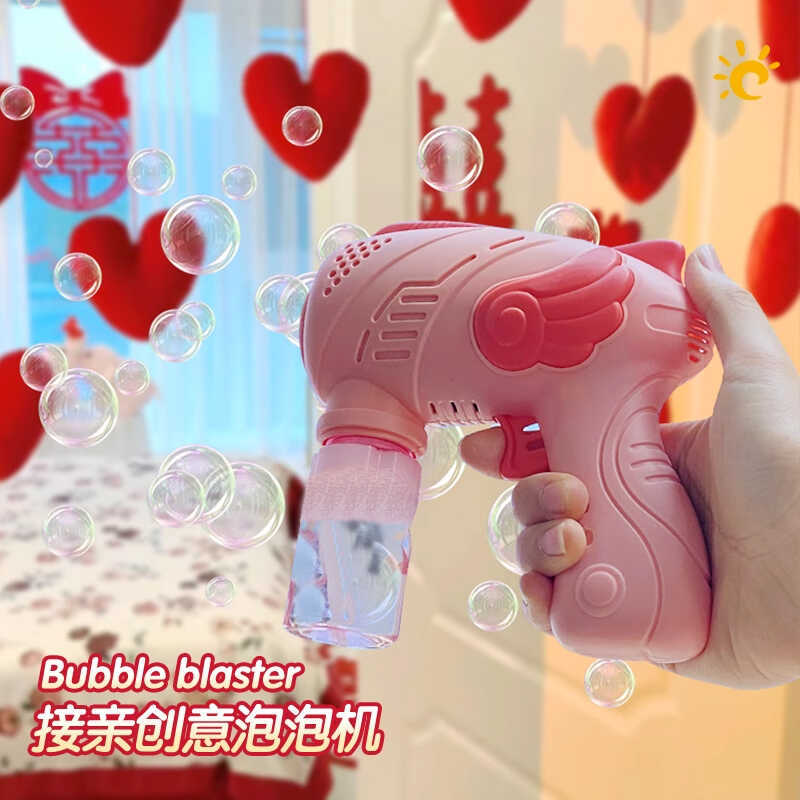キスして泡を吹く銃を持っている花嫁団の雰囲気写真を撮る道具結婚戸外芝生結婚式専用泡機