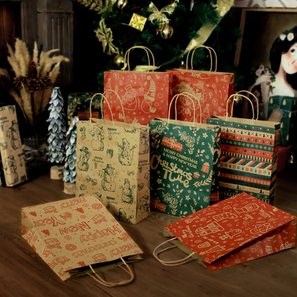 現物クリスマス手提げ袋赤緑満版黄クラフト紙袋新年祝日共通プレゼント装飾袋