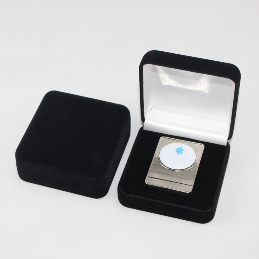 お金を入れて赤い青い黒いバッジの箱にロゴのブローチを印刷します。