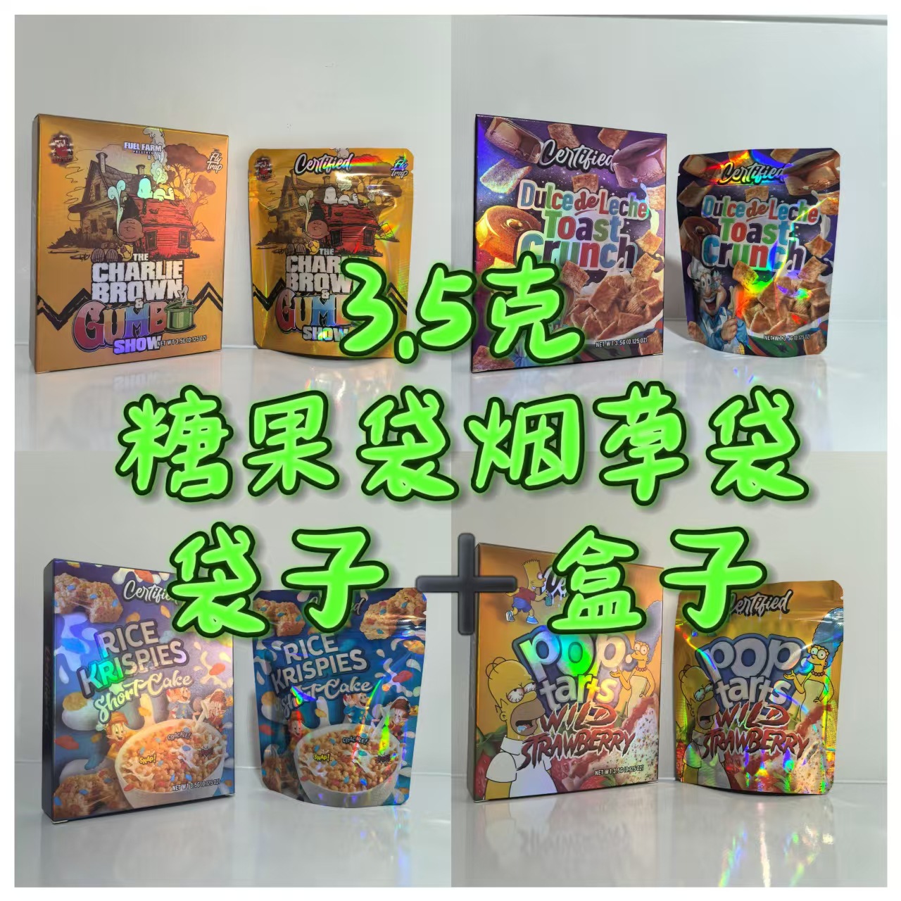 アメリカのキャンディバッグ、フラワーバッグ、タバコバッグ、アルミメッキチャイルドロック自立袋、異形袋、3.5g、1g、既製品、箱付き