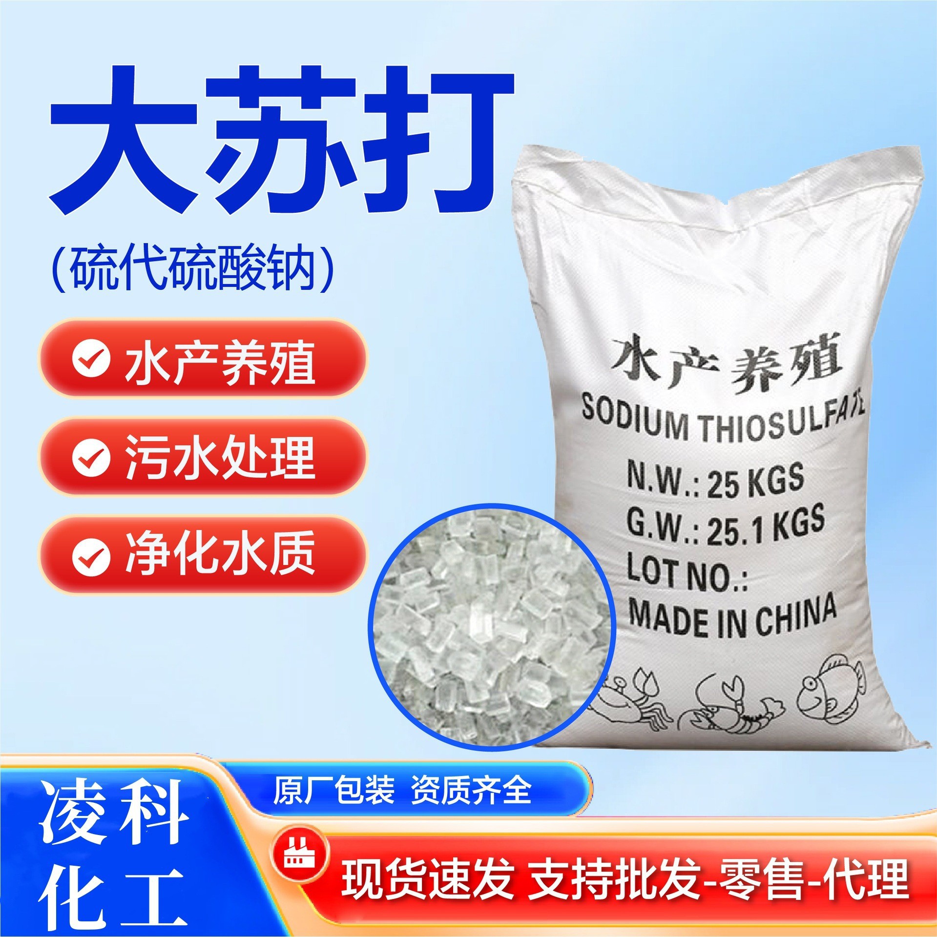工業用袋詰め結晶状硫代硫酸ナトリウム、下水処理・養殖専用塩素除去浄水剤、大蘇打