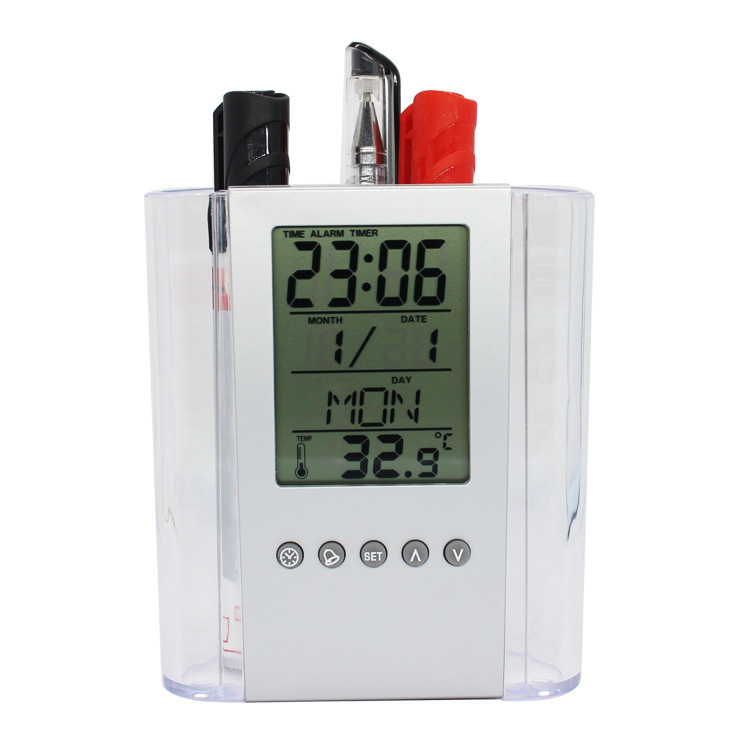 クリエイティブなペン立て時計 LED電子時計 学生文具 デスクトップ目覚まし時計 音声制御 永久カレンダー 電子時計 温度計