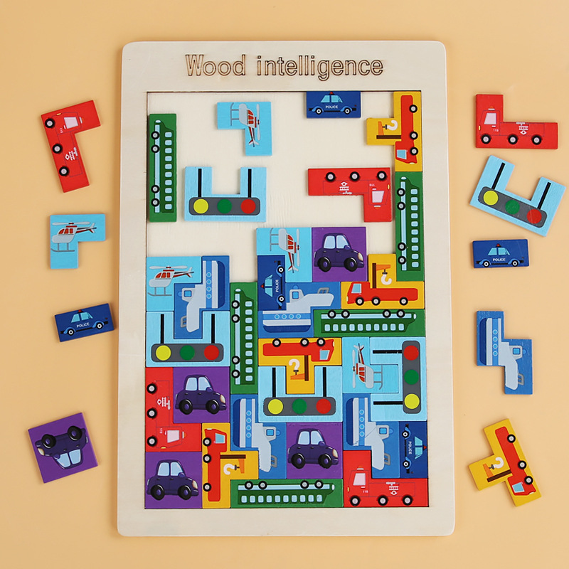 木のテトリスのパズルの子供は早く交通動物の果物を教えます。